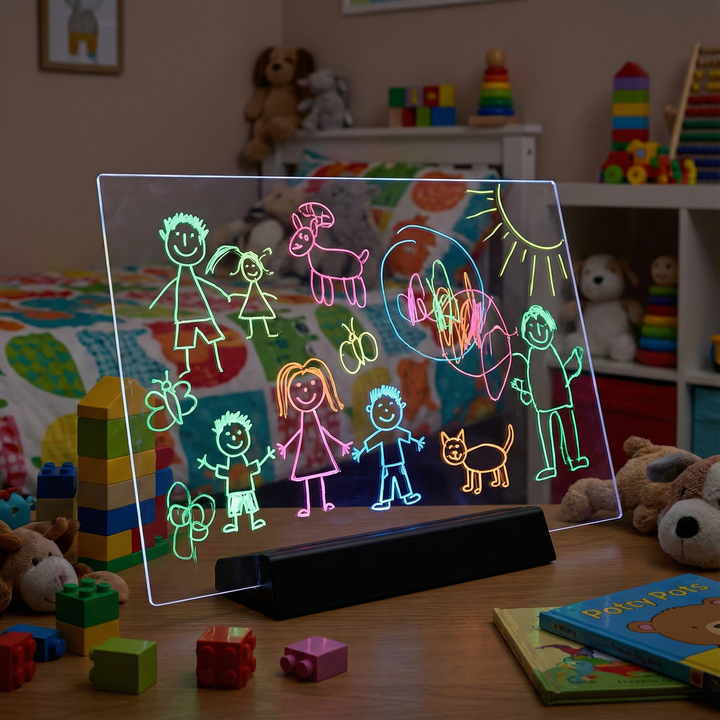 PrismoBoard™ er en innovativ akryl tegnetavle designet til børn, der kombinerer kreativitet med LED-lys. Ideel til kreavtivitet, læring og underholdning. Den tåler daglig brug, og det holdbare design passer perfekt på børneværelset. Fremmer fantasi og motoriske færdigheder med denne sjove og funktionelle tegnetavle.